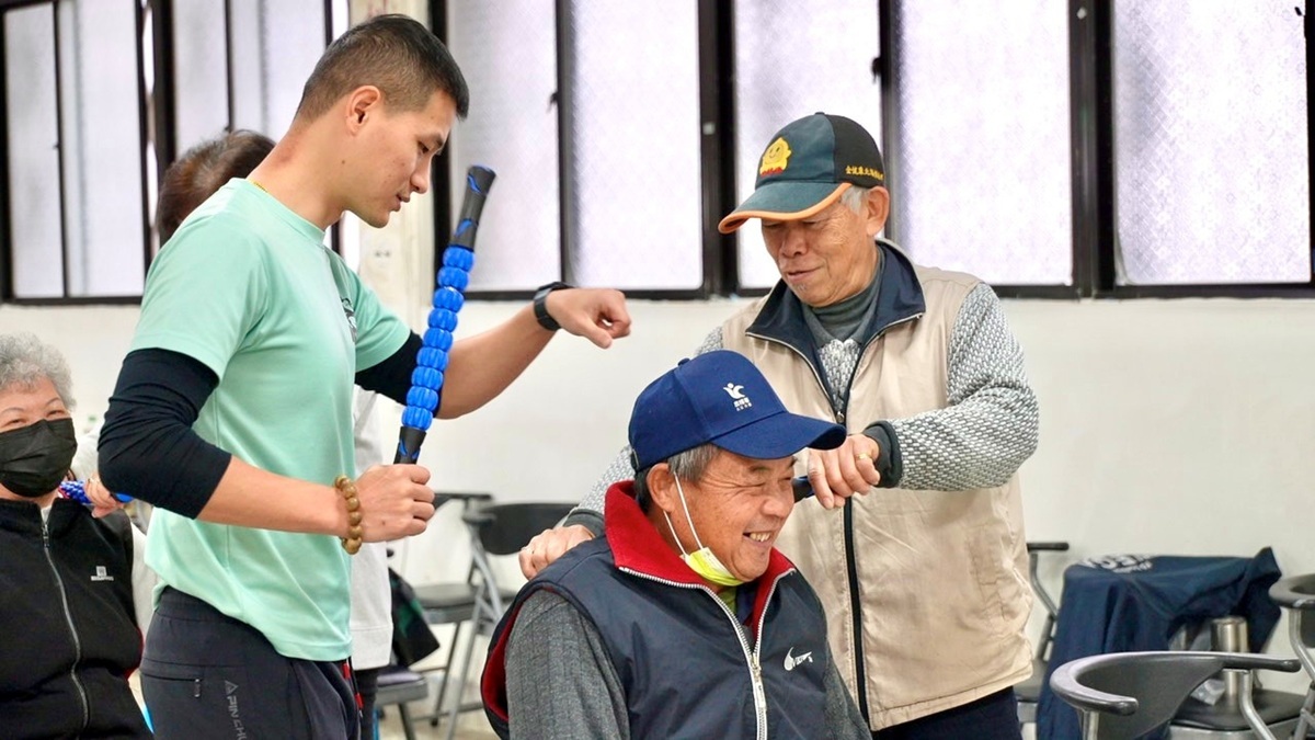 最近天氣比較寒冷,長輩筋骨容易僵硬,血液循環也不好,因此透過筋膜棒的輔助,讓僵硬的筋絡活絡起來。 圖/紅樹林有線電視提供 | |